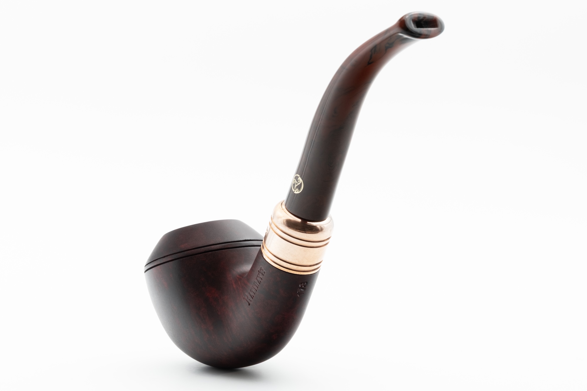 Zu diesem Anlass haben wir wieder eine kleine Auflage von lediglich 150 Pfeifen auflegen lassen. Die bordeauxfarbene Rhodesian aus Bruyère trägt einen schmucken Kupferring und ist mit einem Mundstück aus Acryl in Cumberland-Optik versehen.